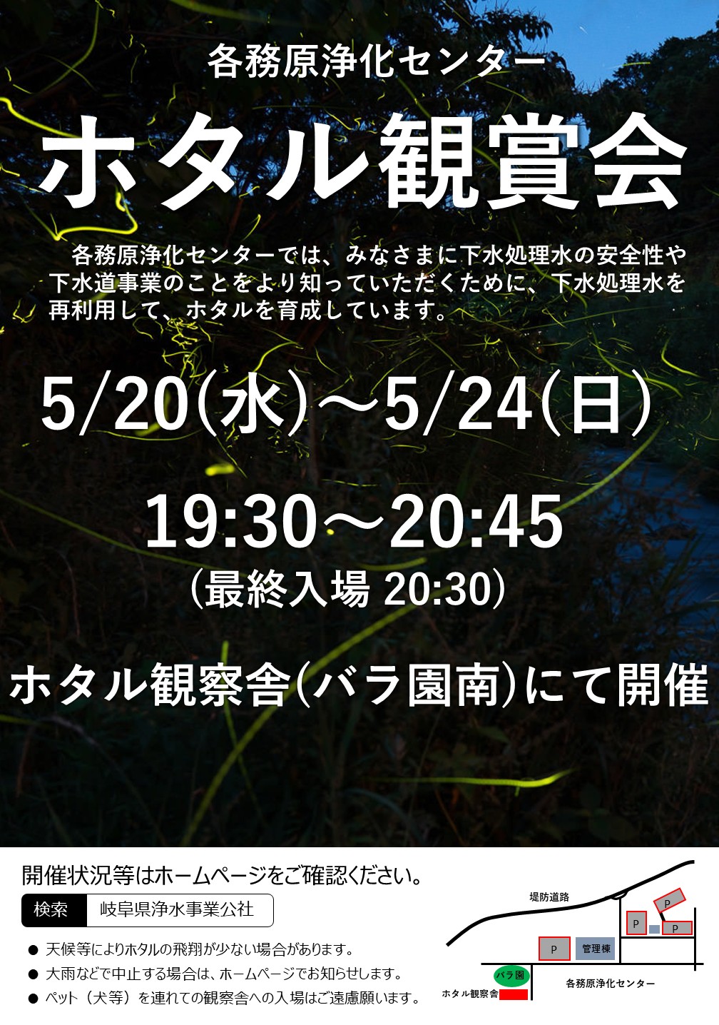 例年、ホタルの飛翔時期に合わせて、ホタルの観賞会を開催しております。(5月下旬〜6月上旬頃) ⇒ イベント